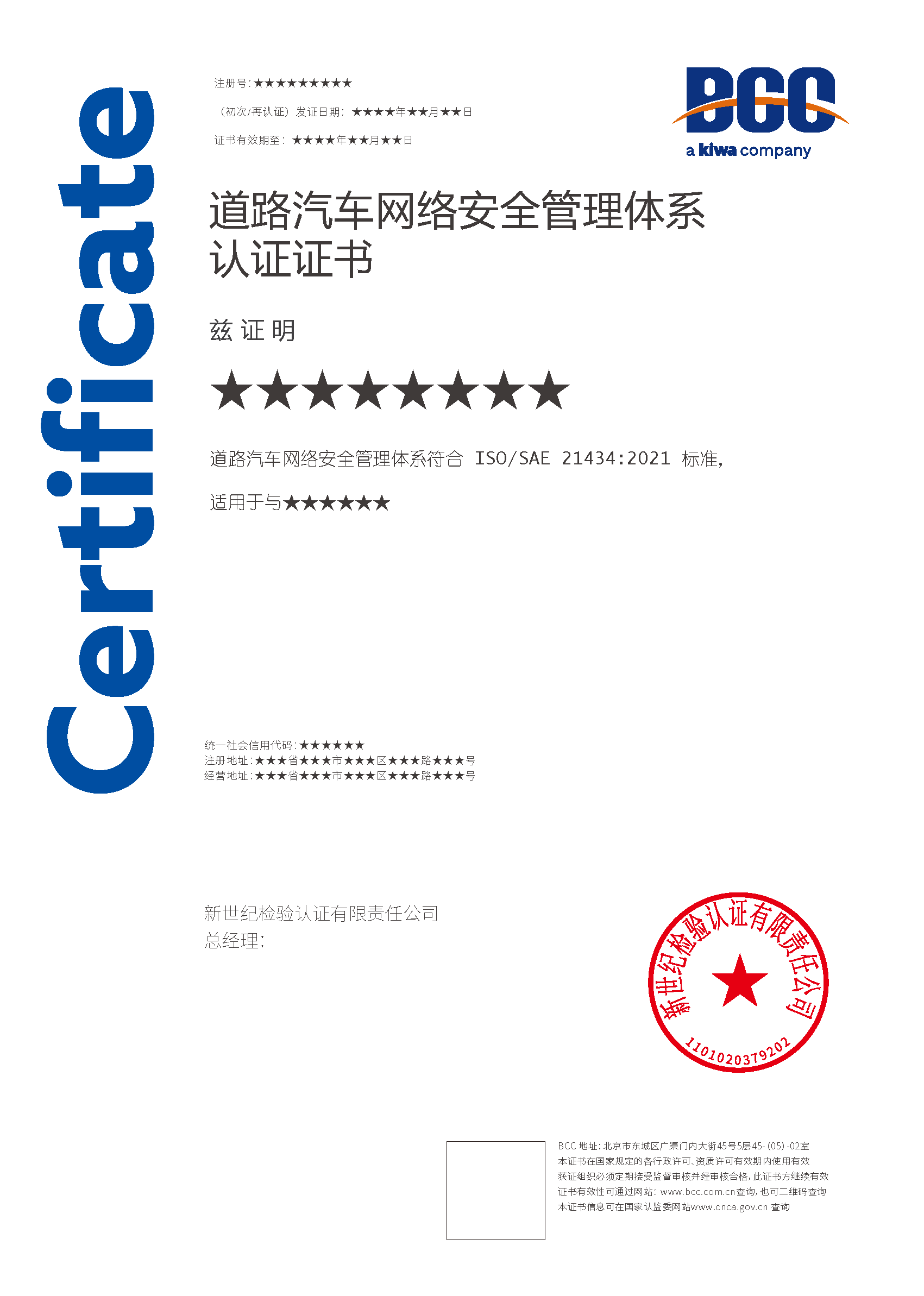 本頁涉及的認證服務(wù)中均有對應(yīng)的《認證實施規(guī)則》,BCC擁有其最終解釋權(quán)。任何組織及個人未經(jīng)BCC許可,不得以任何形式全部或部分使用(法律要求除外)認證相關(guān)信息。如需獲取相關(guān)實施規(guī)則請用以下方式聯(lián)系獲?。弘娫挘?10-58579316 郵箱:fwjs@kiwa.cn