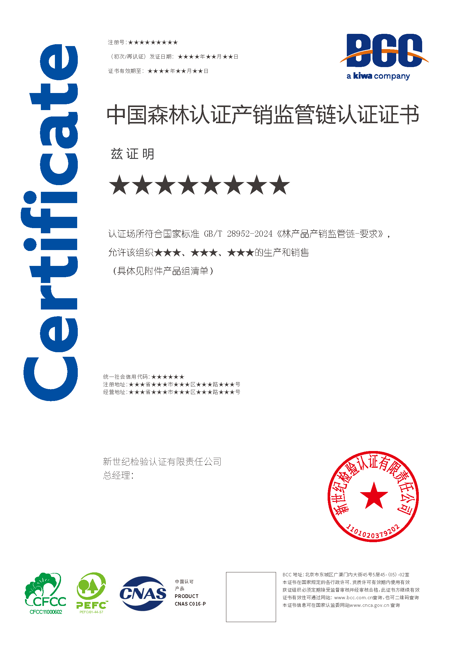 Kiwa BCC已經(jīng)獲得英國(guó)土壤協(xié)會(huì)SA授權(quán),可在中國(guó)開展FSC®產(chǎn)銷監(jiān)管鏈認(rèn)證(FSC® N001893)和PEFC產(chǎn)銷監(jiān)管鏈認(rèn)證。同時(shí),可為組織提供CFCC產(chǎn)銷監(jiān)管鏈認(rèn)證服務(wù)。