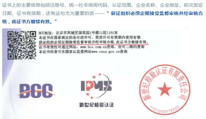 證書上的主要信息包括注冊號、統(tǒng)一社會信用代碼、認證范圍、企業(yè)名稱、企業(yè)地址、初次發(fā)證日期、證書有效期,還有這句尤為重要的話——“ 獲證組織必須定期接受監(jiān)督審核并經(jīng)審核合格,此證書方繼續(xù)有效。”
