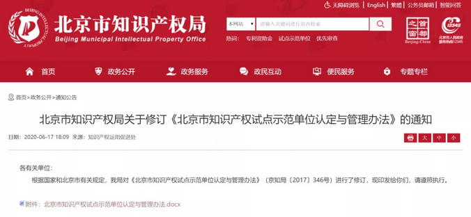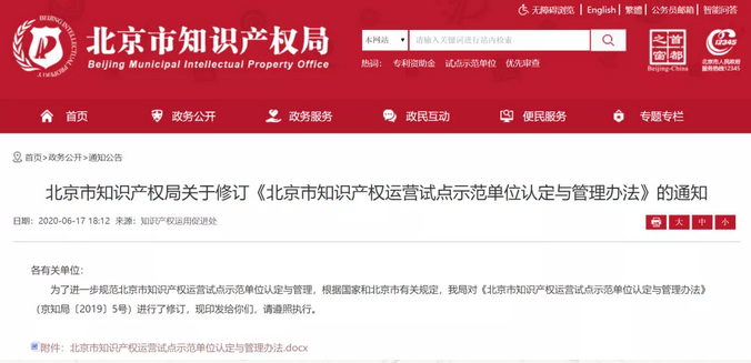 6月17日,為深化實施創(chuàng)新驅(qū)動戰(zhàn)略和首都知識產(chǎn)權戰(zhàn)略,進一步規(guī)范知識產(chǎn)權試點示范單位認定與管理工作,北京市知識產(chǎn)權局修訂的《北京市知識產(chǎn)權試點示范單位認定與管理辦法》(京知局〔2020〕171號)正式發(fā)布。