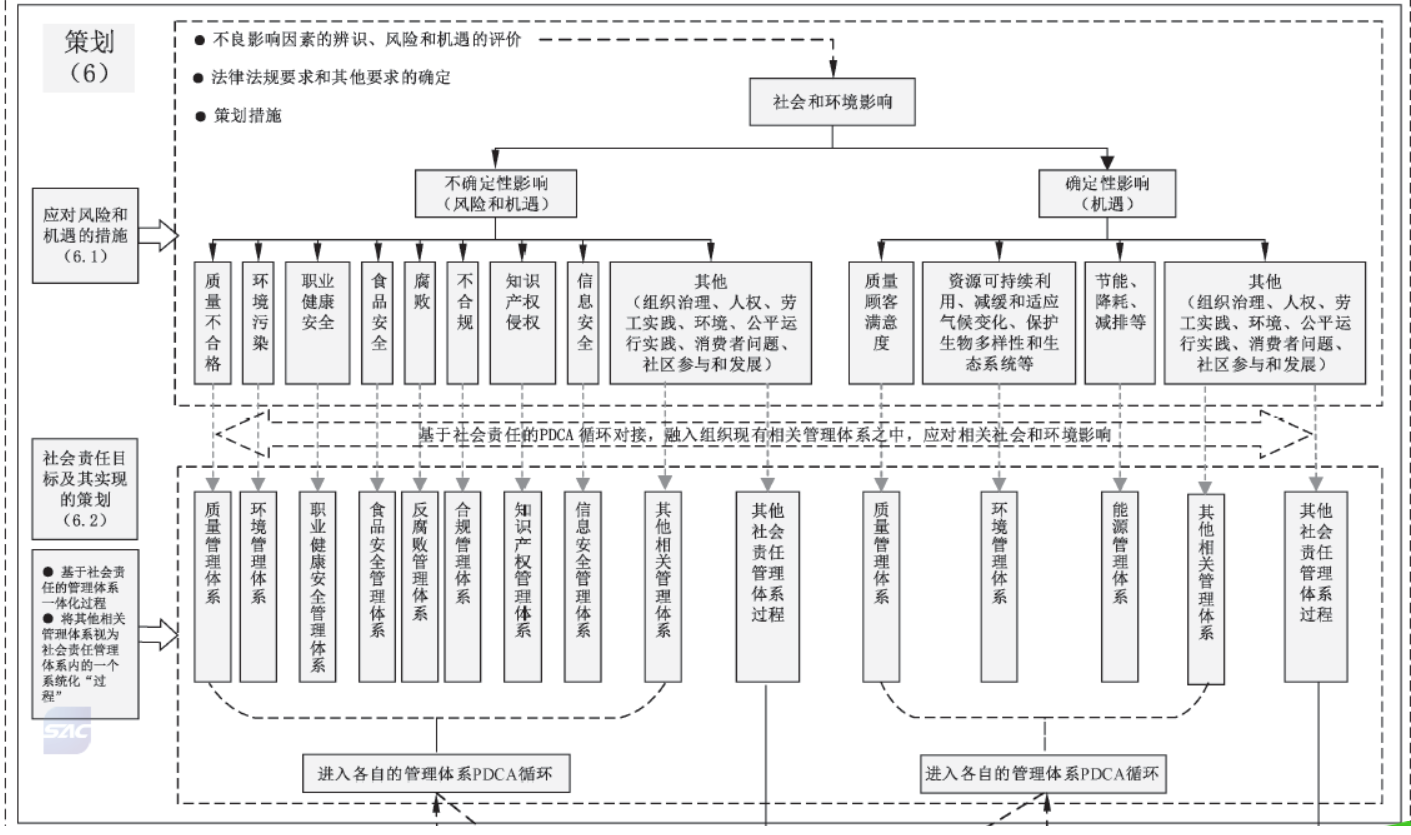 使組織能夠以社會責任為抓手,從頂層治理(價值觀、使命、精神和發(fā)展戰(zhàn)略等)視野出發(fā),統(tǒng)領(lǐng)、規(guī)范、協(xié)調(diào)和融合組織內(nèi)其他相關(guān)管理體系(如質(zhì)量管理體系、 環(huán)境管理體系、職業(yè)健康安全管理體系、食品安全管理體系、反腐敗管理體系、合規(guī)管理體系、知識產(chǎn)權(quán)管理體系、信息安全管理體系等),有效實現(xiàn)組織管理體系的一體化。